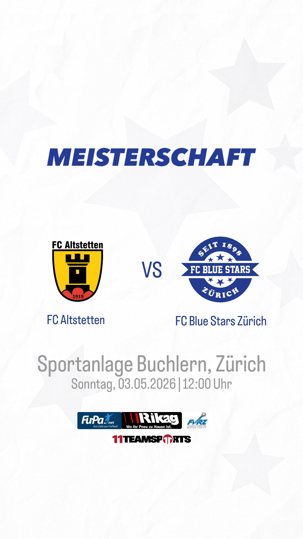 Am Sonntag, 03. Mai 2026 trifft unsere Mannschaft auswärts auf den FC Altstetten.Spielbeginn ist um 12:00 Uhr auf der Sportanlage Buchlern.